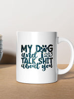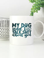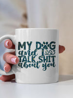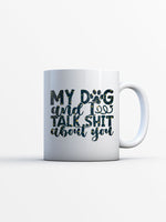 My Dog And I Talk Shit About You with star font printed on the front of this White Ceramic Coffee Mug.