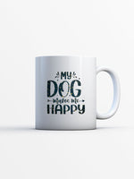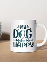 My Dog Makes Me Happy with star font printed on the front of this White Ceramic Coffee Mug.